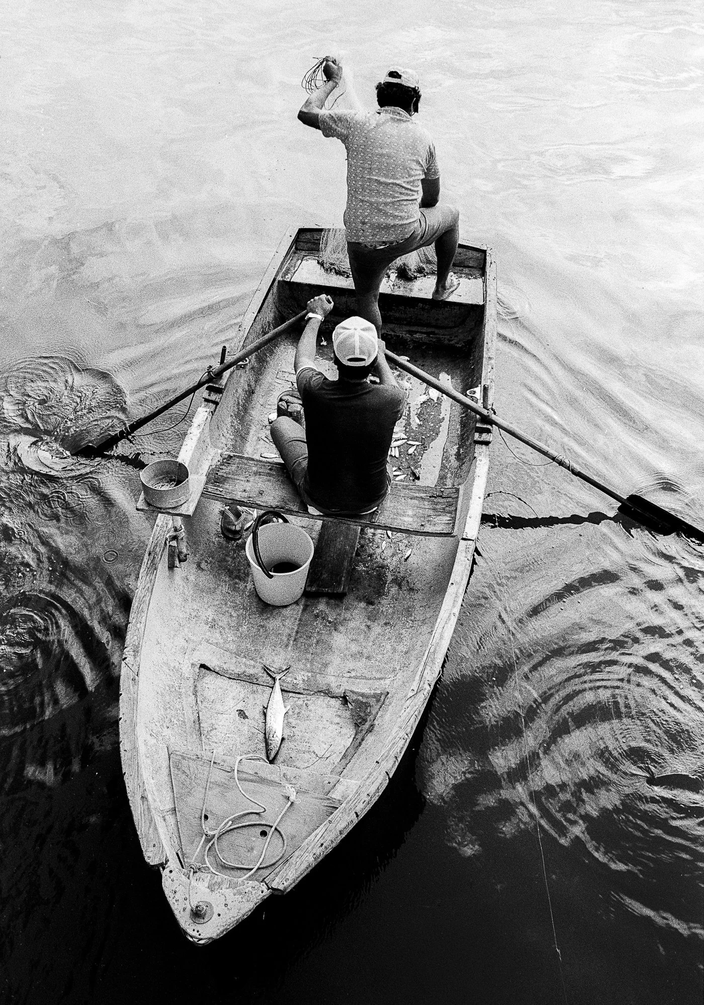 At the bow, a single fish rests, distinct, solitary, carrying a quiet weight. Behind it, near the stern, smaller fish lie scattered, less pronounced, yet undeniably present. The balance feels uneven, as if attention and consequence do not fall equally, as if what is singular can somehow overshadow what is many.